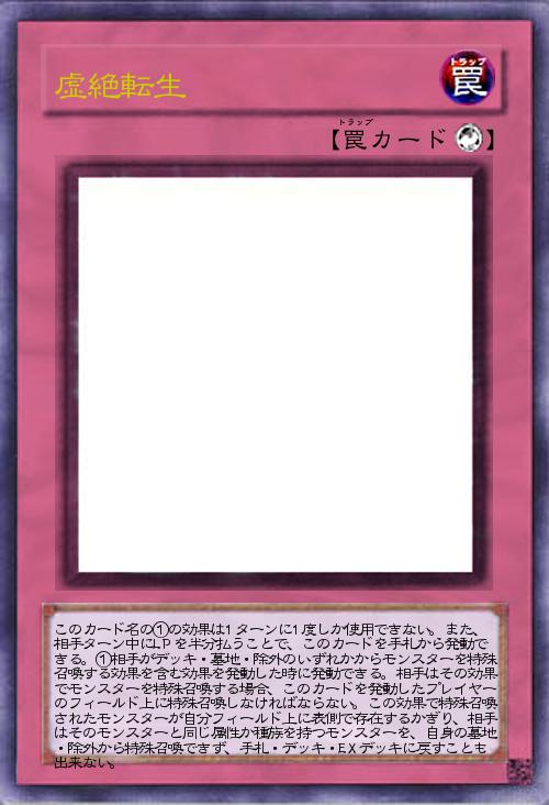 | このカード名の①の効果は1ターンに1度しか使用できない。また、相手ターン中にLPを半分払うことで、このカードを手札から発動できる。①相手がデッキ・墓地・除外のいずれかからモンスターを特殊召喚する効果を含む効果を発動した時に発動できる。相手はその効果でモンスターを特殊召喚する場合、このカードを発動したプレイヤーのフィールド上に特殊召喚しなければならない。この効果で特殊召喚されたモンスターが自分フィールド上に表側で存在するかぎり、相手はそのモンスターと同じ属性か種族を持つモンスターを、自身の墓地・除外から特殊召喚できず、手札・デッキ・EXデッキに戻すことも出来ない。 | |||