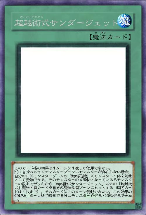 | このカード名の効果は1ターンに1度しか使用できない。 ①:自分のメインモンスターゾーンにモンスターが存在しない場合、自分のEXモンスターゾーンの「超越迅機」Xモンスター1体を対象として発動できる。そのモンスターのX素材となっているSモンスターの数までデッキから「超越術式サンダージェット」以外の「超越術式」魔法・罠カードを自分の魔法&罠ゾーンにセットする(同名カードは1枚まで)。そのカードはこのターン発動できない。この効果の発動後、ターン終了時まで自分はモンスターを召喚・特殊召喚できない。 | |||