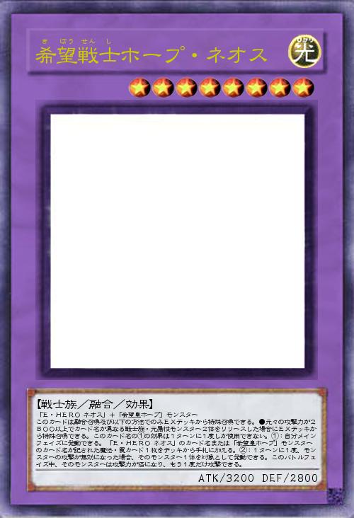 | 「E・HERO ネオス」+「希望皇ホープ」モンスター このカードは融合召喚及び以下の方法でのみEXデッキから特殊召喚できる。●元々の攻撃力が2500以上でカード名が異なる戦士族・光属性モンスター2体をリリースした場合にEXデッキから特殊召喚できる。このカード名の①の効果は1ターンに1度しか使用できない。①:自分メインフェイズに発動できる。「E・HERO ネオス」のカード名または「希望皇ホープ」モンスターのカード名が記された魔法・罠カード1枚をデッキから手札に加える。②:1ターンに1度、モンスターの攻撃が無効になった場合、そのモンスター1体を対象として発動できる。このバトルフェイズ中、そのモンスターは攻撃力が倍になり、もう1度だけ攻撃できる。 | |||