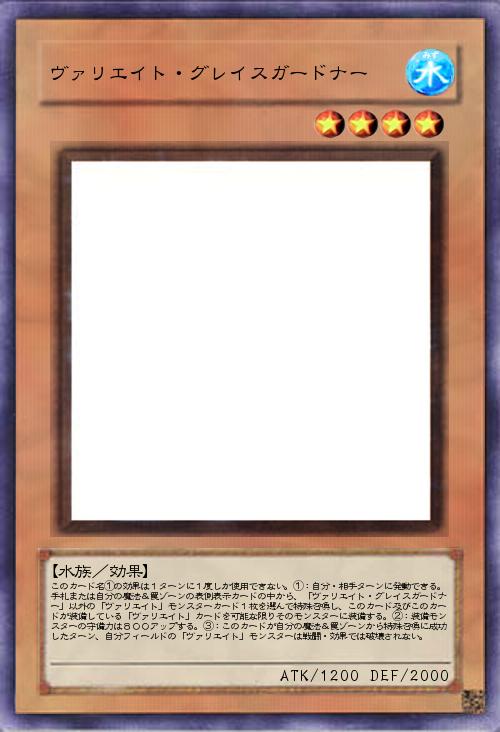 | このカード名①の効果は1ターンに1度しか使用できない。①:自分・相手ターンに発動できる。手札または自分の魔法&罠ゾーンの表側表示カードの中から、「ヴァリエイト・グレイスガードナー」以外の「ヴァリエイト」モンスターカード1枚を選んで特殊召喚し、このカード及びこのカードが装備している「ヴァリエイト」カードを可能な限りそのモンスターに装備する。②:装備モンスターの守備力は800アップする。③:このカードが自分の魔法&罠ゾーンから特殊召喚に成功したターン、自分フィールドの「ヴァリエイト」モンスターは戦闘・効果では破壊されない。 | |||
