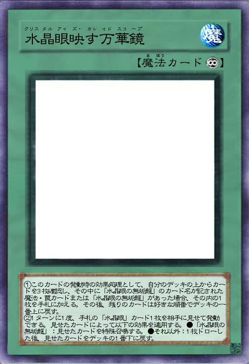 | ①このカードの発動時の効果処理として、自分のデッキの上からカードを3枚確認し、その中に「水晶眼の無垢龍」のカード名が記された魔法・罠カードまたは「水晶眼の無垢龍」があった場合、その内の1枚を手札に加える。その後、残りのカードは好きな順番でデッキの一番上に戻す。 ②1ターンに1度、手札の「水晶眼」カード1枚を相手に見せて発動できる。見せたカードによって以下の効果を適用する。●「水晶眼の無垢龍」:見せたカードを特殊召喚する。●それ以外:1枚ドローした後、見せたカードをデッキの1番下に戻す。 | |||