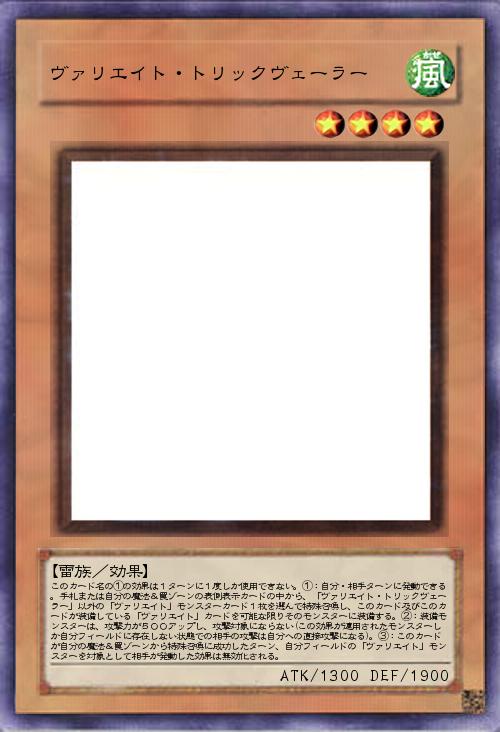 | このカード名の①の効果は1ターンに1度しか使用できない。①:自分・相手ターンに発動できる。手札または自分の魔法&罠ゾーンの表側表示カードの中から、「ヴァリエイト・トリックヴェーラー」以外の「ヴァリエイト」モンスターカード1枚を選んで特殊召喚し、このカード及びこのカードが装備している「ヴァリエイト」カードを可能な限りそのモンスターに装備する。②:装備モンスターは、攻撃力が500アップし、攻撃対象にならない(この効果が適用されたモンスターしか自分フィールドに存在しない状態での相手の攻撃は自分への直接攻撃になる)。③:このカードが自分の魔法&罠ゾーンから特殊召喚に成功したターン、自分フィールドの「ヴァリエイト」モンスターを対象として相手が発動した効果は無効化される。 | |||