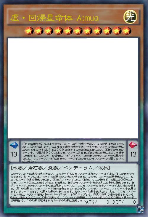 | このモンスターは通常召喚できない。このカード名のモンスターは自分フィールド上に1体しか表側で存在できず、1ターンに1度、カードの効果でのみ特殊召喚できる。このモンスターの効果発動に対し、お互いにカード効果を発動できない。①相手フィールド上に、種族を1つしか持たず、攻撃力が2000以上のモンスターが2体以上表側で存在する状態で、相手がモンスターを特殊召喚した場合に発動できる。相手フィールド上のモンスターを可能な限りリリースし、このモンスターを相手フィールド上に特殊召喚する。②①の効果でこのモンスターが特殊召喚されているかぎり、このモンスターはコントロールを変更できず、リリースできず、攻撃・効果の対象にならず、他のカード効果を受けない。また、このモンスターの攻・守は、お互いの墓地・除外のカード1枚につき500アップする。③①の効果で特殊召喚されてから6ターン後のエンドフェイズ時に発動する。このカードを破壊し、フィールド上の全ての魔法・罠カードを破壊する。この効果で破壊されたカードの効果は発動しない。 | |||