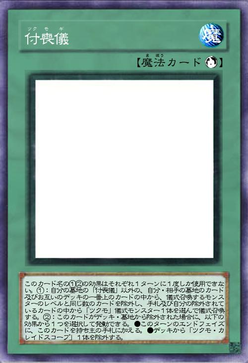 | このカード名の①②の効果はそれぞれ1ターンに1度しか使用できない。①:自分の墓地の「付喪儀」以外の、自分・相手の墓地のカード及びお互いのデッキの一番上のカードの中から、儀式召喚するモンスターのレベルと同じ数のカードを除外し、手札及び自分の除外されているカードの中から「ツクモ」儀式モンスター1体を選んで儀式召喚する。②:このカードがデッキ・墓地から除外された場合に、以下の効果から1つを選択して発動できる。●このターンのエンドフェイズに、このカードを持ち主の手札に加える。●デッキから「ツクモ・カレイドスコープ」1体を除外する。 | |||