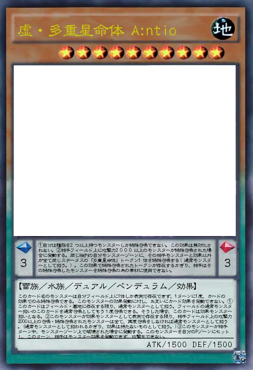 | ①自分は種族を2つ以上持つモンスターしか特殊召喚できない。この効果は無効化されない。②相手フィールド上に攻撃力2000以上のモンスターが特殊召喚された場合に発動する。同じ縦列の自分モンスターゾーンに、その相手モンスターと効果以外が全て同じステータスの「多重星命体」トークン1体を特殊召喚する(通常モンスターとして扱う。)。この効果で特殊召喚されたトークンが存在するかぎり、相手はその特殊召喚したモンスターを特殊召喚の為の素材に使用できない。 | |||