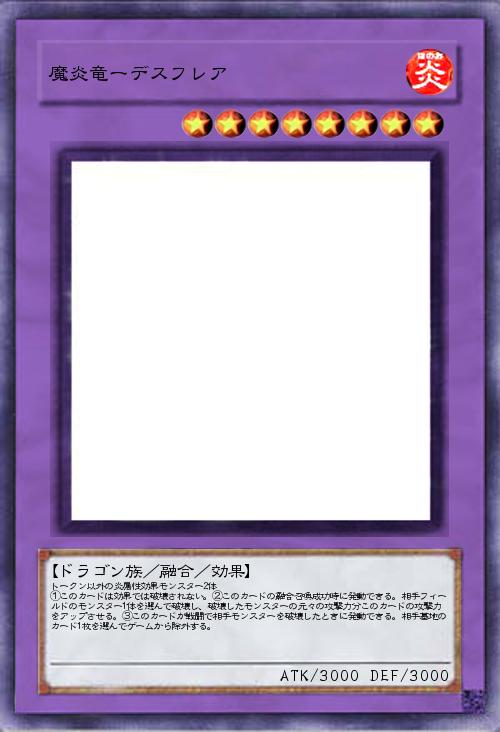 | トークン以外の炎属性効果モンスター2体 ①このカードは効果では破壊されない。②このカードの融合召喚成功時に発動できる。相手フィールドのモンスター1体を選んで破壊し、破壊したモンスターの元々の攻撃力分このカードの攻撃力をアップさせる。③このカードが戦闘で相手モンスターを破壊したときに発動できる。相手墓地のカード1枚を選んでゲームから除外する。 | |||