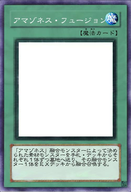 | 「アマゾネス」融合モンスターによって決められた素材モンスターを手札・デッキからそれぞれ1体ずつ墓地へ送り、その融合モンスター1体をEXデッキから融合召喚する。 | |||