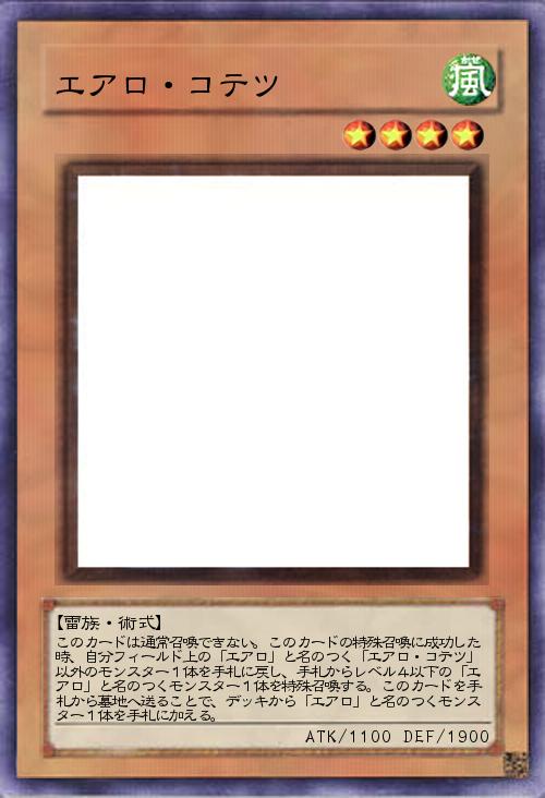 | このカードは通常召喚できない。このカードの特殊召喚に成功した時、自分フィールド上の「エアロ」と名のつく「エアロ・コテツ」以外のモンスター1体を手札に戻し、手札からレベル4以下の「エアロ」と名のつくモンスター1体を特殊召喚する。このカードを手札から墓地へ送ることで、デッキから「エアロ」と名のつくモンスター1体を手札に加える。 | |||