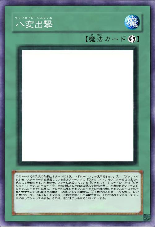 | このカード名の①②の効果は1ターンに1度、いずれか1つしか使用できない。①:「ヴァリエイト」モンスターカードを装備している自分フィールドの「ヴァリエイト」モンスターを2体まで対象として発動できる。対象のモンスターに装備されている「ヴァリエイト」カードの中から「ヴァリエイト」モンスターカードを、その対象とした数だけ選んで特殊召喚し、対象の自分フィールドのモンスターを手札に戻し、その手札に戻したモンスターをその特殊召喚したモンスターにそれぞれ1体ずつまで可能な限り装備カード扱いとして装備する。②:墓地のこのカードを除外し、自分の墓地の「ヴァリエイト」モンスター3体を対象として発動できる。その3体のモンスターをデッキに戻してシャッフルする。その後、自分はデッキから1枚ドローする。 | |||