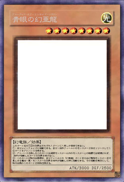 | このカード名の①③の効果はそれぞれ1ターンに1度しか使用できない。 ①:自分メインフェイズに発動できる。自分・相手フィールドのモンスター2体をリリースしてこのカードをアドバンス召喚する。 ②:アドバンス召喚したこのカードは通常モンスター以外のモンスターとの戦闘では破壊されず、 相手が発動したカードの効果を受けない。 ③:このカードが除外状態場合、自分フィールドの「幻亜龍」カードまたは幻竜族モンスターを対象とする魔法・罠・モンスターの効果を相手が発動した時に発動できる。その発動を無効にして、除外状態のこのカードを特殊召喚する。 | |||