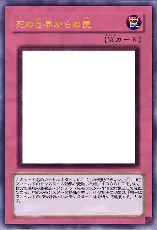 | このカード名のカードは1ターンに1枚しか発動できない。①:相手フィールドのモンスターの効果が発動した時、1000LPを払い、自分の墓地の悪魔族・アンデット族モンスター1体を対象として発動できる。対象のモンスターを特殊召喚し、その相手の効果は「相手はフィールドの特殊召喚されたモンスター1体を選んで破壊する」となる。 | |||