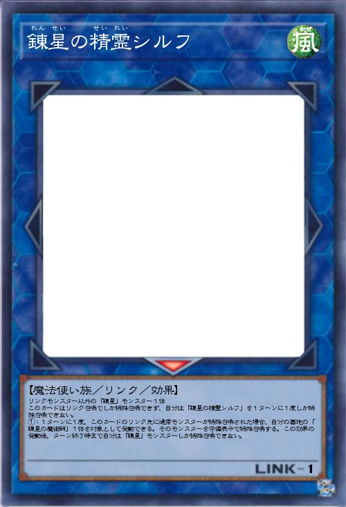 | リンクモンスター以外の「錬星」モンスター1体 このカードはリンク召喚でしか特殊召喚できず、自分は「錬星の精霊シルフ」を1ターンに1度しか特殊召喚できない。 ①:1ターンに1度、このカードのリンク先に通常モンスターが特殊召喚された場合、自分の墓地の「錬星の魔術師」1体を対象として発動できる。そのモンスターを守備表示で特殊召喚する。この効果の発動後、ターン終了時まで自分は「錬星」モンスターしか特殊召喚できない。 | |||