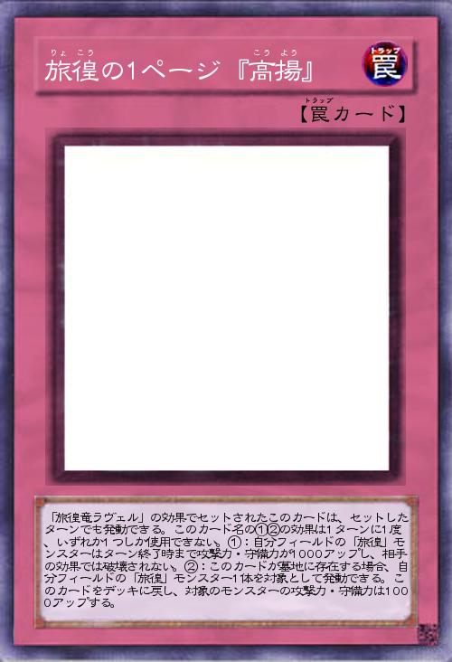| 「旅徨竜ラヴェル」の効果でセットされたこのカードは、セットしたターンでも発動できる。このカード名の①②の効果は1ターンに1度、いずれか1つしか使用できない。①:自分フィールドの「旅徨」モンスターはターン終了時まで攻撃力・守備力が1000アップし、相手の効果では破壊されない。②:このカードが墓地に存在する場合、自分フィールドの「旅徨」モンスター1体を対象として発動できる。このカードをデッキに戻し、対象のモンスターの攻撃力・守備力は1000アップする。 | |||