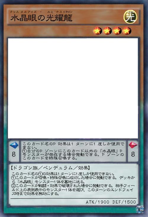 | このカード名のP効果は1ターンに1度しか使用できない。 ①自分のPゾーンにこのカード以外の「水晶眼」Pモンスターが存在する場合発動できる。Pゾーンのこのカードを特殊召喚する。 | |||