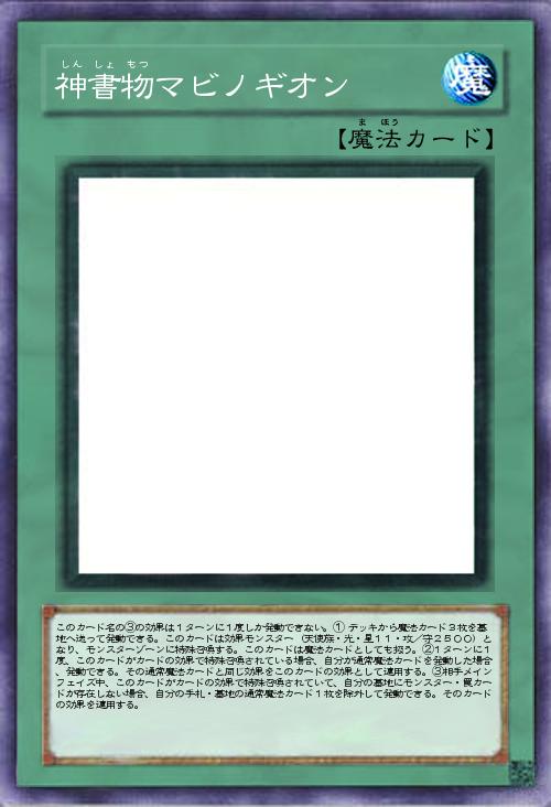 | このカード名の③の効果は1ターンに1度しか発動できない。① デッキから魔法カード3枚を墓地へ送って発動できる。このカードは効果モンスター(天使族・光・星11・攻/守2500)となり、モンスターゾーンに特殊召喚する。このカードは魔法カードとしても扱う。②1ターンに1度、このカードがカードの効果で特殊召喚されている場合、自分が通常魔法カードを発動した場合、発動できる。その通常魔法カードと同じ効果をこのカードの効果として適用する。③相手メインフェイズ中、このカードがカードの効果で特殊召喚されていて、自分の墓地にモンスター・罠カードが存在しない場合、自分の手札・墓地の通常魔法カード1枚を除外して発動できる。そのカードの効果を適用する。 | |||