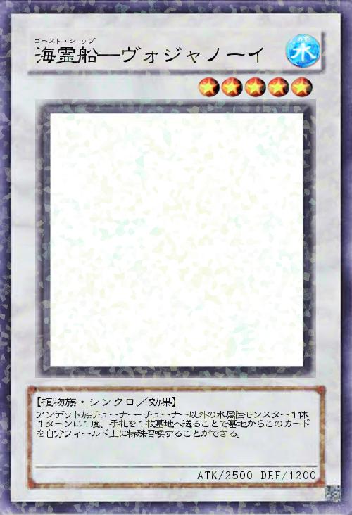 「海霊のシンクロモンスター。墓地から任意のタイミング(自分のターンのみ)で自身を蘇生するユニークな効果を持っています。海霊賊のチューナーと組み合わせると・・・。元々回数制限はなかったのですが、流石に自重しました(´・ω・`)ヴォジャノーイは水の精霊。元ネタ的にウンディーネのお仲間。海霊船は海霊賊の怨念の集合体と思っていただければ(`・ω・´)」(2012-07-25 12:42)