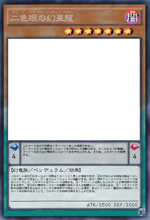 | このカード名の①のモンスター効果は1ターンに1度しか使用できず、③の方法による特殊召喚は1ターンに1度しかできない。①:自分メインフェイズに発動できる。自分・相手フィールドのモンスター2体をリリースして、このカードをアドバンス召喚する。②:アドバンス召喚したこのカードが表側表示で存在する限り、自分の幻竜族モンスターの戦闘で相手に与える戦闘ダメージは倍になる。③:このカードが除外状態の場合またはEXデッキに表側表示で存在している場合、自分フィールド・墓地の幻竜族モンスター1体を除外することで、このカードを特殊召喚することができる。 | |||