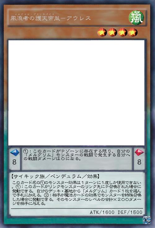 「オリジナルテーマ「メルグリム」「プリンキパクス」のペンデュラムモンスターです。カード名の「風浪者の護天帝胤」のルビは「メルグリム・プリンキパクス」です。」(2023-03-04 21:32)