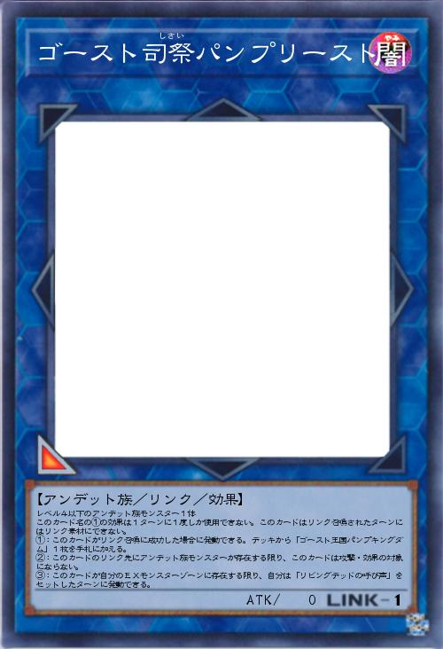 | レベル4以下のアンデット族モンスター1体 このカード名の①の効果は1ターンに1度しか使用できない。このカードはリンク召喚されたターンにはリンク素材にできない。 ①:このカードがリンク召喚に成功した場合に発動できる。デッキから「ゴースト王国パンプキングダム」1枚を手札に加える。 ②:このカードのリンク先にアンデット族モンスターが存在する限り、このカードは攻撃・効果の対象にならない。 ③:このカードが自分のEXモンスターゾーンに存在する限り、自分は「リビングデッドの呼び声」をセットしたターンに発動できる。 | |||