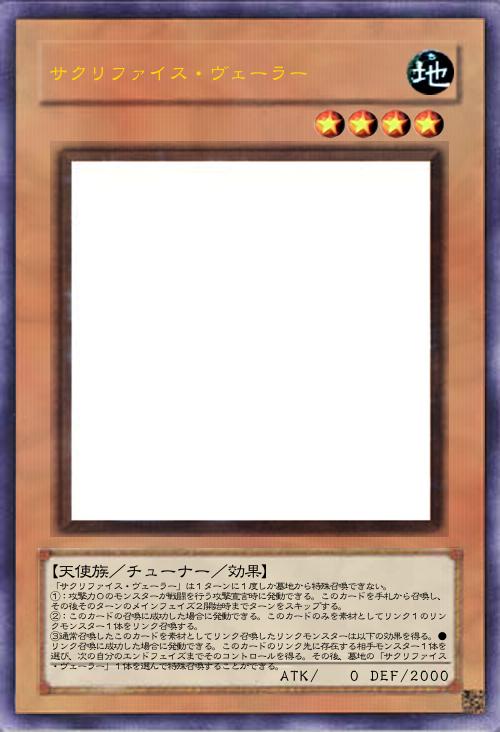 | 「サクリファイス・ヴェーラー」は1ターンに1度しか墓地から特殊召喚できない。 ①:攻撃力0のモンスターが戦闘を行う攻撃宣言時に発動できる。このカードを手札から召喚し、その後そのターンのメインフェイズ2開始時までターンをスキップする。 ②:このカードの召喚に成功した場合に発動できる。このカードのみを素材としてリンク1のリンクモンスター1体をリンク召喚する。 ③通常召喚したこのカードを素材としてリンク召喚したリンクモンスターは以下の効果を得る。●リンク召喚に成功した場合に発動できる。このカードのリンク先に存在する相手モンスター1体を選び、次の自分のエンドフェイズまでそのコントロールを得る。その後、墓地の「サクリファイス・ヴェーラー」1体を選んで特殊召喚することができる。 | |||