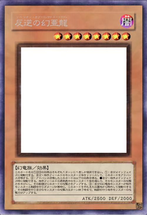 | このカード名の①②③の効果はそれぞれ1ターンに1度しか使用できない。①:自分メインフェイズに発動できる。自分・相手フィールドのモンスター2体をリリースして、このカードをアドバンス召喚する。②:アドバンス召喚したこのカードは以下の効果を得る。●自分・相手メインフェイズ時に発動できる。相手フィールドの表側表示のモンスター1体を選んで、そのモンスターの攻撃力を半分にし、その数値分このカードの攻撃力をアップする。③:自分の幻竜族モンスターが相手モンスターと戦闘を行うダメージ計算時に、このカードを手札または墓地から除外して発動できる。その戦闘を行う自分のモンスターの攻撃力はターン終了時まで、戦闘を行う相手モンスターの攻撃力分アップする。 | |||