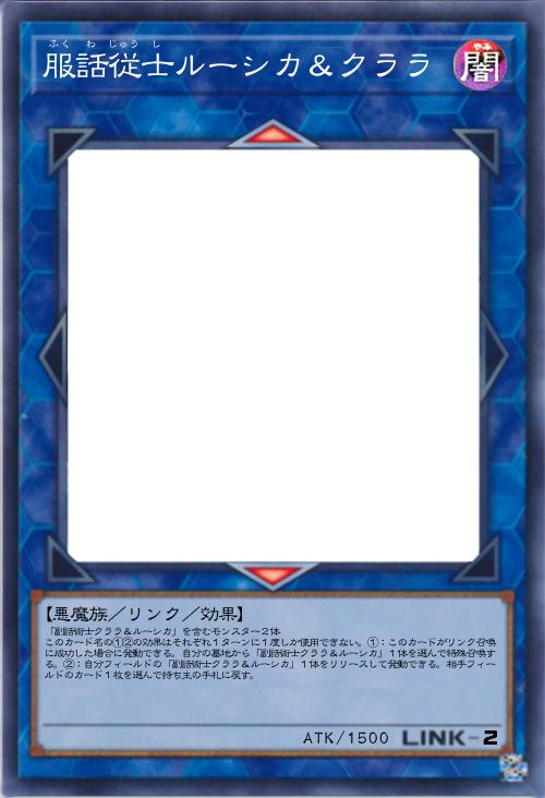 | 「副話術士クララ&ルーシカ」を含むモンスター2体 このカード名の①の効果は1ターンに1度しか使用できない。①:このカードがリンク召喚に成功した場合に発動できる。自分の墓地から「副話術士クララ&ルーシカ」1体を選んで特殊召喚する。この効果で特殊召喚したモンスターは攻撃力が1500アップし、以下の効果を得る。●このモンスターをリリースし、相手フィールドの表側表示のカード1枚を対象として発動できる。そのカードを破壊する。自分モンスターゾーンに「服話従士ルーシカ&クララ」が存在する場合、この効果は相手ターンでも発動できる。 | |||