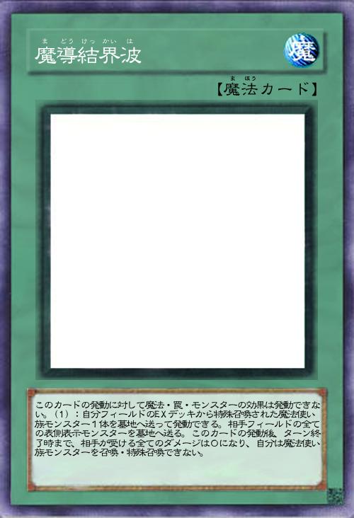 | このカードの発動に対して魔法・罠・モンスターの効果は発動できない。(1):自分フィールドのEXデッキから特殊召喚された魔法使い族モンスター1体を墓地へ送って発動できる。相手フィールドの全ての表側表示モンスターを墓地へ送る。このカードの発動後、ターン終了時まで、相手が受ける全てのダメージは0になり、自分は魔法使い族モンスターを召喚・特殊召喚できない。 | |||