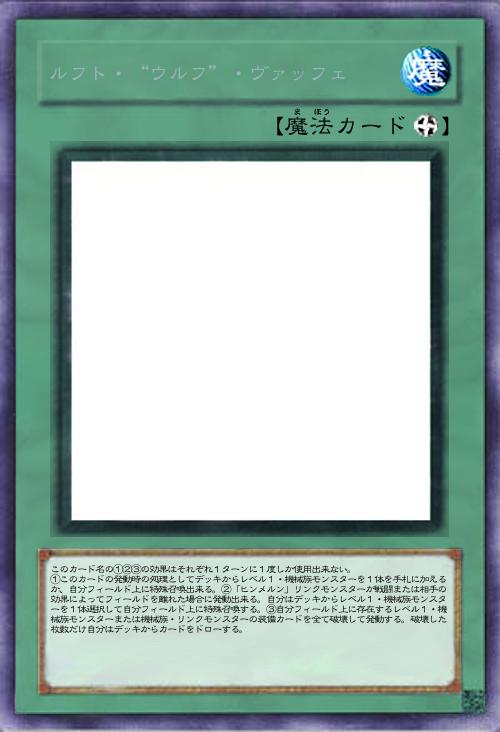 | このカード名の①②③の効果はそれぞれ1ターンに1度しか使用出来ない。 ①このカードの発動時の処理としてデッキからレベル1・機械族モンスターを1体を手札に加えるか、自分フィールド上に特殊召喚出来る。②「ヒンメルン」リンクモンスターが戦闘または相手の効果によってフィールドを離れた場合に発動出来る。自分はデッキからレベル1・機械族モンスターを1体選択して自分フィールド上に特殊召喚する。③自分フィールド上に存在するレベル1・機械族モンスターまたは機械族・リンクモンスターの装備カードを全て破壊して発動する。破壊した枚数だけ自分はデッキからカードをドローする。 | |||