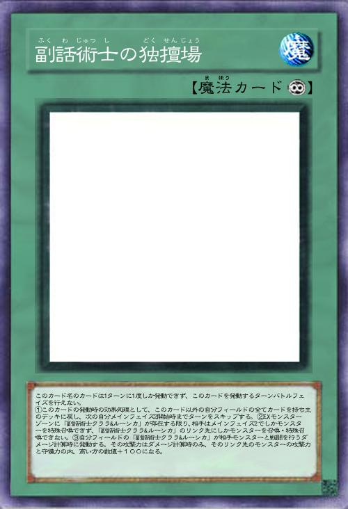 | このカード名のカードは1ターンに1度しか発動できず、このカードを発動するターンバトルフェイズを行えない。 ①このカードの発動時の効果処理として、このカード以外の自分フィールドの全てカードを持ち主のデッキに戻し、次の自分メインフェイズ2開始時までターンをスキップする。②EXモンスターゾーンに「副話術士クララ&ルーシカ」が存在する限り、相手はメインフェイズ2でしかモンスターを特殊召喚できず、「副話術士クララ&ルーシカ」のリンク先にしかモンスターを召喚・特殊召喚できない。③自分フィールドの「副話術士クララ&ルーシカ」が相手モンスターと戦闘を行うダメージ計算時に発動する。その攻撃力はダメージ計算時のみ、そのリンク先のモンスターの攻撃力と守備力の内、高い方の数値+100になる。 | |||