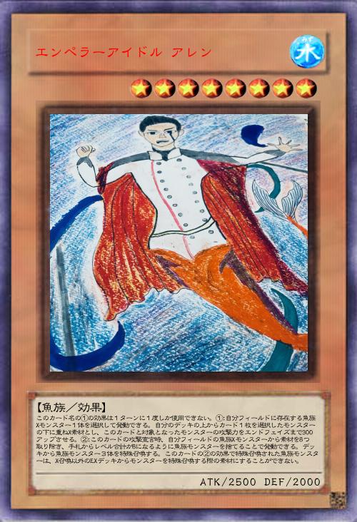 | このカード名の①の効果は1ターンに1度しか使用できない。①:自分フィールドに存在する魚族Xモンスター1体を選択して発動できる。自分のデッキの上からカード1枚を選択したモンスターの下に重ねX素材とし、このカードと対象となったモンスターの攻撃力をエンドフェイズまで300アップさせる。②:このカードの攻撃宣言時、自分フィールドの魚族Xモンスターから素材を8つ取り除き、手札からレベル合計が8になるように魚族モンスターを捨てることで発動できる。デッキから魚族モンスター3体を特殊召喚する。このカードの②の効果で特殊召喚された魚族モンスターは、X召喚以外のEXデッキからモンスターを特殊召喚する際の素材にすることができない。 | |||