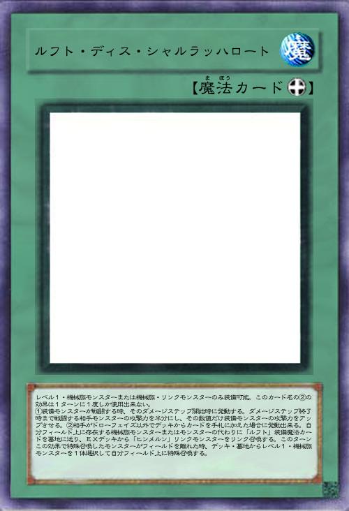 | レベル1・機械族モンスターまたは機械族・リンクモンスターのみ装備可能。このカード名の②の効果は1ターンに1度しか使用出来ない。 ①装備モンスターが戦闘する時、そのダメージステップ開始時に発動する。ダメージステップ終了時まで戦闘する相手モンスターの攻撃力を半分にし、その数値だけ装備モンスターの攻撃力をアップさせる。②相手がドローフェイズ以外でデッキからカードを手札に加えた場合に発動出来る。自分フィールド上に存在する機械族モンスターまたはモンスターの代わりに「ルフト」装備魔法カードを墓地に送り、EXデッキから「ヒンメルン」リンクモンスターをリンク召喚する。このターンこの効果で特殊召喚したモンスターがフィールドを離れた時、デッキ・墓地からレベル1・機械族モンスターを1体選択して自分フィールド上に特殊召喚する。 | |||
