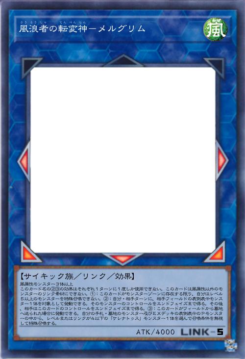 | 風属性モンスター3体以上 このカード名の②③の効果はそれぞれ1ターンに1度しか使用できない。このカードは風属性以外のモンスターのリンク素材にできない。①:このカードがモンスターゾーンに存在する限り、自分はレベル5以上のモンスターを特殊召喚できない。②:自分・相手ターンに、相手フィールドの表側表示モンスター1体を対象として発動できる。そのモンスターのコントロールをエンドフェイズまで得る。その後、相手はこのカードのコントロールをエンドフェイズまで得る。③:このカードがフィールドから墓地へ送られた場合に発動できる。自分の手札・墓地のモンスター及びEXデッキの表側表示のPモンスターの中から、レベルまたはリンクが4以下の「ケレナトゥス」モンスター1体を選んで召喚条件を無視して特殊召喚する。 | |||