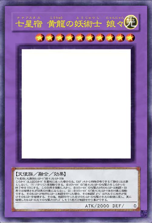 | 「七星宿」光属性モンスター+「娘々」モンスター3体 このカードは上記のカードを墓地に送った場合のみ、EXデッキから特殊召喚できる(「融合」は必要としない)。(1):1ターンに1度発動できる。自分フィールドの「娘々」モンスターの攻撃力をこのターンの終了時まで0にする。この効果を発動したターン、自分フィールドの攻撃力が0のモンスターは戦闘・効果では破壊されず効果の対象にならない。(2):自分フィールドの「娘々」モンスター1体を対象に発動できる。そのモンスターが相手モンスターと戦闘を行った場合、その戦闘ダメージは代わりに相手が受けそのモンスターを破壊する。その後、戦闘を行った自分のモンスターの攻撃力を元の数値に戻し、更に破壊したモンスターの元々の攻撃力分アップしもう1度だけ戦闘を行う事ができる。 | |||