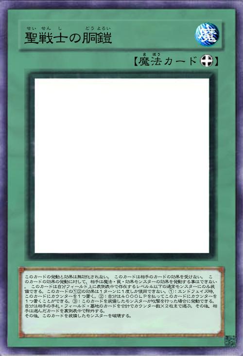 | このカードの発動と効果は無効化されない。 このカードは相手のカードの効果を受けない。 このカードの効果の発動に対して、相手は魔法・罠・効果モンスターの効果を発動する事はできない。 このカードは自分フィールド上に表側表示で存在するレベル4以下の通常モンスターにのみ装備できる。このカードの①②の効果は1ターンに1度しか使用できない。①:エンドフェイズ時、このカードにカウンターを1つ置く。②:自分は4000LPを払ってこのカードにカウンターを1つ置くことができる。③:このカードを装備したモンスターが攻撃を行った場合に発動できる。自分は相手の手札・フィールド・墓地のカードを合計でカウンター数×2枚まで選ぶ。その後、相手は選んだカードを裏側表示で除外する。 その後、このカードを装備したモンスターを破壊する。 | |||