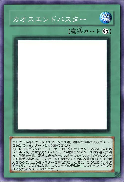 | このカード名のカードは1ターンに1度、相手が効果によるダメージを受けていないターンしか発動できない。 ①:自分のデッキからチューナー及びペンデュラムモンスター以外のレベル5以上で攻撃力1600以下の通常モンスター1体を墓地に送って発動できる。墓地に送ったモンスターのレベル×400のダメージを相手に与える。このカードを発動するために攻撃力0または守備力3000以上のモンスターを墓地に送った場合、この効果によるダメージは1000になる。このカードの発動後、このターン相手が受ける全てのダメージは0になる。 | |||