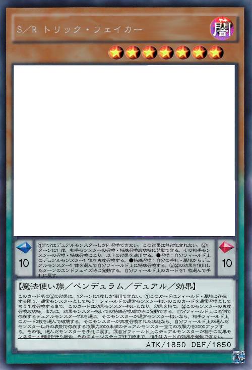 | ①自分はデュアルモンスターしかP召喚できない。この効果は無効化されない。②1ターンに1度、相手モンスターの召喚・特殊召喚成功時に発動できる。その相手モンスターの召喚・特殊召喚により、以下の効果を適用する。●召喚:自分フィールド上のデュアルモンスター1体を再度召喚する。●特殊召喚:自分の手札・墓地からデュアルモンスター1体を選んで自分フィールド上に特殊召喚する。③②の効果を使用したターンのエンドフェイズ時に発動する。自分フィールド上のカードを1枚選んで手札に戻す。 | |||