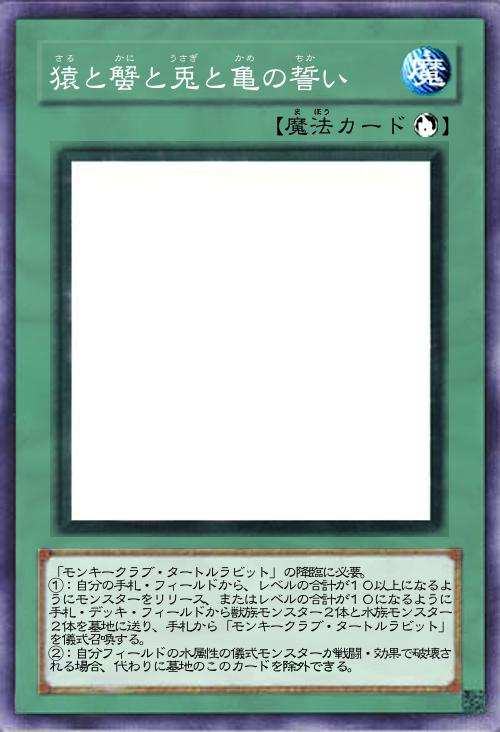 | 「モンキークラブ・タートルラビット」の降臨に必要。 ①:自分の手札・フィールドから、レベルの合計が10以上になるようにモンスターをリリース、またはレベルの合計が10になるように手札・デッキ・フィールドから獣族モンスター2体と水族モンスター2体を墓地に送り、手札から「モンキークラブ・タートルラビット」を儀式召喚する。 ②:自分フィールドの水属性の儀式モンスターが戦闘・効果で破壊される場合、代わりに墓地のこのカードを除外できる。 | |||