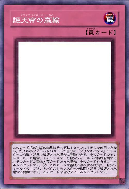 | このカード名の①②の効果はそれぞれ1ターンに1度しか使用できない。①:相手フィールドのカードが自分の「プリンキパクス」モンスターの攻撃・効果で破壊された場合、その内の1枚を対象として発動できる。そのカードがモンスターだった場合、そのモンスターを自分フィールドに特殊召喚する。そのカードが魔法・罠カードだった場合、そのカードを自分フィールドにセットする。②:このカードが墓地に存在する状態で、自分フィールドの「プリンキパクス」モンスターが戦闘・効果で破壊された場合に発動できる。このカードを自分フィールドにセットする。 | |||