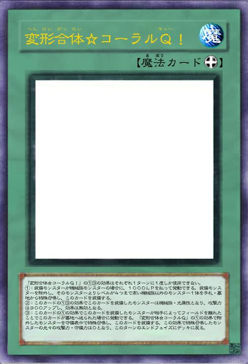 | 「変形合体☆コーラルQ!」の①③の効果はそれぞれ1ターンに1度しか使用できない。 ①:装備モンスターが機械族モンスターの場合に、1000LPを払って発動できる。装備モンスターを除外し、そのモンスターよりレベルが4つまで高い機械族以外のモンスター1体を手札・墓地から特殊召喚し、このカードを装備する。 ②:このカードの①③の効果でこのカードを装備したモンスターは機械族・光属性となり、攻撃力は900アップし、効果は無効となる。 ③:このカードの①の効果でこのカードを装備したモンスターが相手によってフィールドを離れたことでこのカードが墓地へ送られた場合に発動できる。「変形合体☆コーラルQ」の①の効果で除外したモンスターを守備表示で特殊召喚し、このカードを装備する。この効果で特殊召喚したモンスターの元々の攻撃力・守備力は0となり、このターンのエンドフェイズにデッキに戻る。 | |||