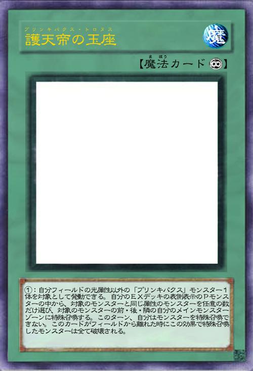 | ①:自分フィールドの光属性以外の「プリンキパクス」モンスター1体を対象として発動できる。自分のEXデッキの表側表示のPモンスターの中から、対象のモンスターと同じ属性のモンスターを任意の数だけ選び、対象のモンスターの前・後・隣の自分のメインモンスターゾーンに特殊召喚する。このターン、自分はモンスターを特殊召喚できない。このカードがフィールドから離れた時にこの効果で特殊召喚したモンスターは全て破壊される。 | |||