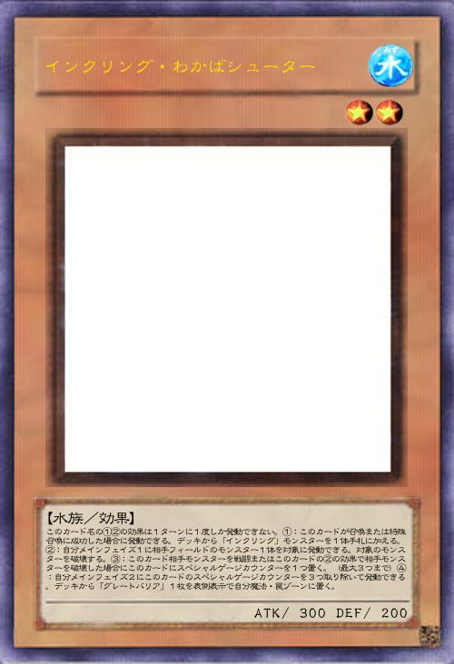 | このカード名の①②の効果は1ターンに1度しか発動できない。①:このカードが召喚または特殊召喚に成功した場合に発動できる。デッキから「インクリング」モンスターを1体手札に加える。②:自分メインフェイズ1に相手フィールドのモンスター1体を対象に発動できる。対象のモンスターを破壊する。③:このカード相手モンスターを戦闘またはこのカードの②の効果で相手モンスターを破壊した場合にこのカードにスペシャルゲージカウンターを1つ置く。(最大3つまで)④:自分メインフェイズ2にこのカードのスペシャルゲージカウンターを3つ取り除いて発動できる。デッキから「グレートバリア」1枚を表側表示で自分魔法・罠ゾーンに置く。 | |||