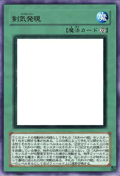 | ①このカードの発動時の処理として手札の「大和十六姫」モンスターを1枚を公開する事が出来る。この効果によって手札で公開されている限りそのモンスターのレベルは4になる。②自分フィールド上に存在する「大和十六姫」モンスターはそのカードに記された装備カードを装備している場合、相手の効果の対象にならない。③「大和十六姫」モンスターが攻撃宣言を行った場合に発動する。相手フィールド上に存在する魔法・罠カードを1枚破壊する。④このカードが相手によって墓地に送られた時に発動出来る。手札の「大和十六姫」モンスターのレベルを4にして自分フィールド上に通常召喚する。 | |||