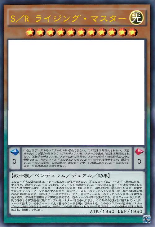 | ①自分はデュアルモンスターしかP召喚できない。この効果は無効化されない。②自分の元々の攻撃力が2000以下のデュアルモンスターが発動した効果は無効化されない。③相手のデュアルモンスター以外の効果モンスターの召喚・特殊召喚成功時に発動できる。自分フィールド上のデュアルモンスター1体を再度召喚するか、通常モンスター扱いに戻す。この効果で1度のターン中、1度選んだモンスターと同名モンスターを再度選ぶことはできない。 | |||