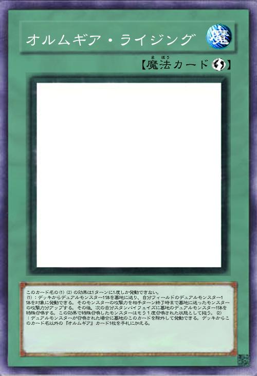 | このカード名の(1)(2)の効果は1ターンに1度しか発動できない。 (1):デッキからデュアルモンスター1体を墓地に送り、自分フィールドのデュアルモンスター1体を対象に発動できる。そのモンスターの攻撃力を相手ターン終了時まで墓地に送ったモンスターの攻撃力分アップする。その後、次の自分スタンバイフェイズに墓地のデュアルモンスター1体を特殊召喚する。この効果で特殊召喚したモンスターはもう1度召喚された状態として扱う。(2):デュアルモンスターが召喚された場合に墓地のこのカードを除外して発動できる。デッキからこのカード名以外の『オルムギア』カード1枚を手札に加える。 | |||