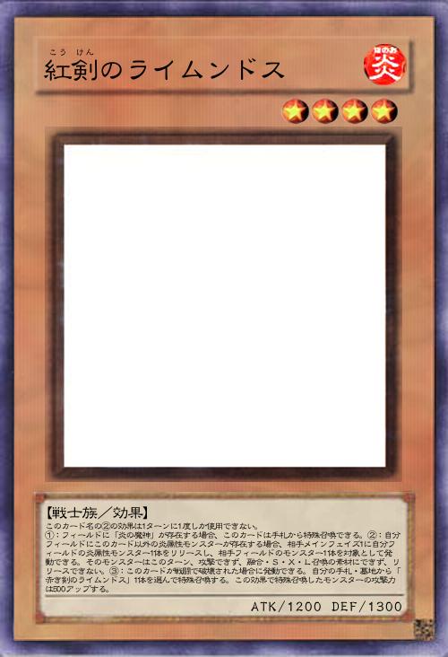 | このカード名の②の効果は1ターンに1度しか使用できない。 ①:フィールドに「炎の魔神」が存在する場合、このカードは手札から特殊召喚できる。②:自分フィールドにこのカード以外の炎属性モンスターが存在する場合、相手メインフェイズ1に自分フィールドの炎属性モンスター1体をリリースし、相手フィールドのモンスター1体を対象として発動できる。そのモンスターはこのターン、攻撃できず、融合・S・X・L召喚の素材にできず、リリースできない。③:このカードが戦闘で破壊された場合に発動できる。自分の手札・墓地から「赤き剣のライムンドス」1体を選んで特殊召喚する。この効果で特殊召喚したモンスターの攻撃力は500アップする。 | |||