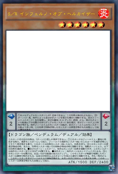| このカード名の④の効果は、1ターンに1度しか使用できない。①このカードはフィールド上・墓地に存在する限り、通常モンスターとして扱う。フィールドの通常モンスター扱いのこのカードを通常召喚としてもう1度召喚する事で、このカードは効果モンスター扱いとなり、効果を持つ。②このモンスターの再度召喚成功時、または、効果モンスター扱いでの特殊召喚成功時に発動できる。発動ターンにより、以下の効果を適用する。●自分のターン:このターン、相手はモンスター効果を発動できず、このモンスターは相手モンスター全てに1回ずつ攻撃できる。●相手ターン:相手ターンはエンドフェイズになる。③このモンスターの攻撃力は、お互いのLPの数値の差だけアップし、このモンスターが戦闘で破壊したモンスターは裏側で除外される。④自分が2000以上のダメージを受けた場合に発動できる。手札・除外から、このモンスターを自分フィールド上に特殊召喚する。お互いのLPに3000以上の差がある時、このモンスターは再度召喚された状態として扱う。 | |||
