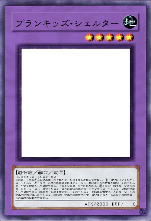| 「プランキッズ」モンスター×2 このカード名の①②の効果はそれぞれ1ターンに1度しか使用できない。①:自分の「プランキッズ」モンスターが、リリースされた場合またはフィールド・墓地から除外された場合、そのモンスター1体を対象として発動できる。そのモンスターを手札に加える。②:自分・相手ターンにこのカードをリリースし、融合モンスター以外の自分の墓地の「プランキッズ」モンスター2体を対象として発動できる(同名カードは1枚まで)。そのモンスターを特殊召喚する。このターン、この効果で特殊召喚したモンスターは戦闘・効果では破壊されず、自分はそのカード及びその同名カードの効果の発動ができない。 | |||