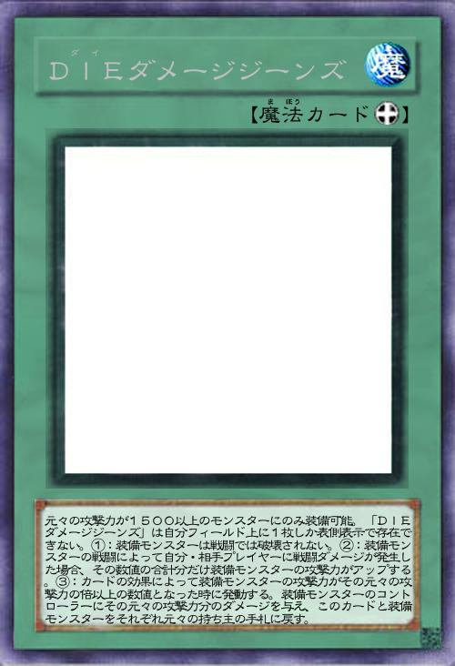 | 元々の攻撃力が1500以上のモンスターにのみ装備可能。「DIEダメージジーンズ」は自分フィールド上に1枚しか表側表示で存在できない。①:装備モンスターは戦闘では破壊されない。②:装備モンスターの戦闘によって自分・相手プレイヤーに戦闘ダメージが発生した場合、その数値の合計分だけ装備モンスターの攻撃力がアップする。③:カードの効果によって装備モンスターの攻撃力がその元々の攻撃力の倍以上の数値となった時に発動する。装備モンスターのコントローラーにその元々の攻撃力分のダメージを与え、このカードと装備モンスターをそれぞれ元々の持ち主の手札に戻す。 | |||