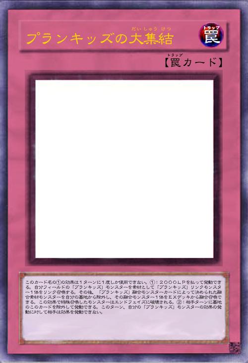 | このカード名の①の効果は1ターンに1度しか使用できない。①:2000LPを払って発動できる。自分フィールドの「プランキッズ」モンスターを素材として「プランキッズ」リンクモンスター1体をリンク召喚する。その後、「プランキッズ」融合モンスターカードによって決められた融合素材モンスターを自分の墓地から除外し、その融合モンスター1体をEXデッキから融合召喚できる。この効果で特殊召喚したモンスターはエンドフェイズに破壊される。②:相手ターンに墓地のこのカードを除外して発動できる。このターン、自分の「プランキッズ」モンスターの効果の発動に対して相手は効果を発動できない。 | |||