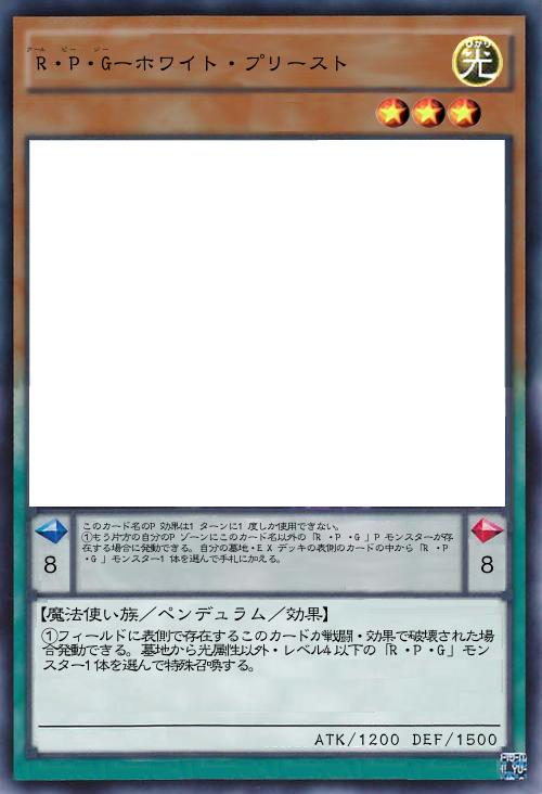 | このカード名のP効果は1ターンに1度しか使用できない。 ①もう片方の自分のPゾーンにこのカード名以外の「R・P・G」Pモンスターが存在する場合に発動できる。自分の墓地・EXデッキの表側のカードの中から「R・P・G」モンスター1体を選んで手札に加える。 | |||